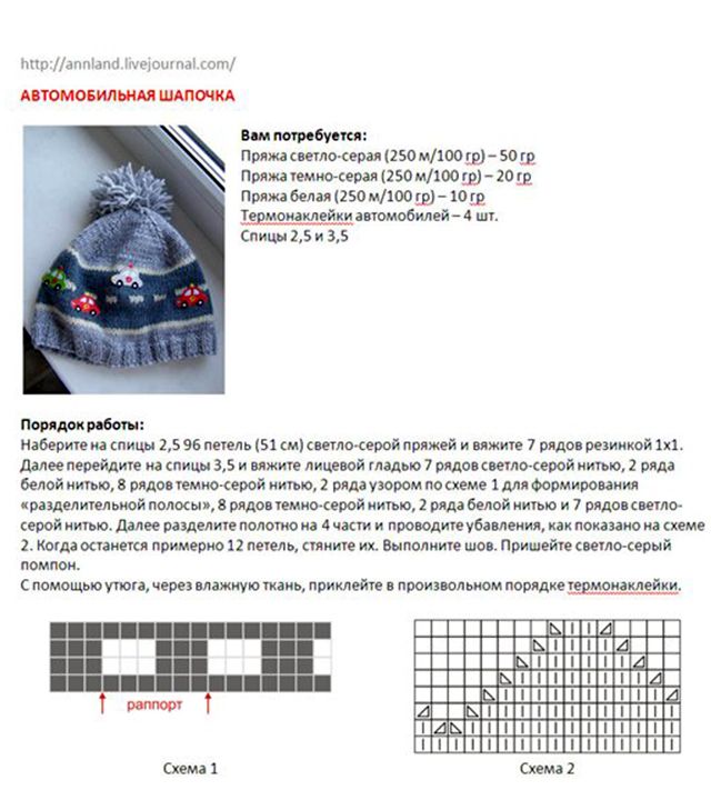 Шапочка связана лицевой гладью из пряжи трех цветов. Ее изюминка в термо-наклейках в виде машинок. Полоски на шапке имитируют дорогу, а машинки дополняют образ автомобильной тематики.