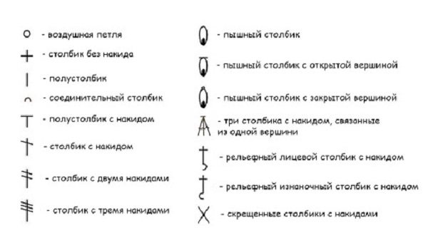 Это базовые элементы вязания. Все остальные обозначения лучше всего посмотреть на картинке с пояснениями.