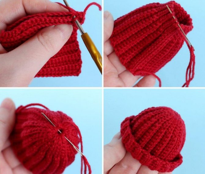 - Когда получится полотно нужного размера, стоит приступить к сборке. Надо не закрывать петли, а продеть через них иголку с вязальной ниткой и затянуть их. Тогда получится нужная форма без каких-либо сложных манипуляций.