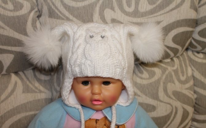 - Шапка-совушка с помпонами и завязкой. Может использоваться для любых игрушек – даже мягких.