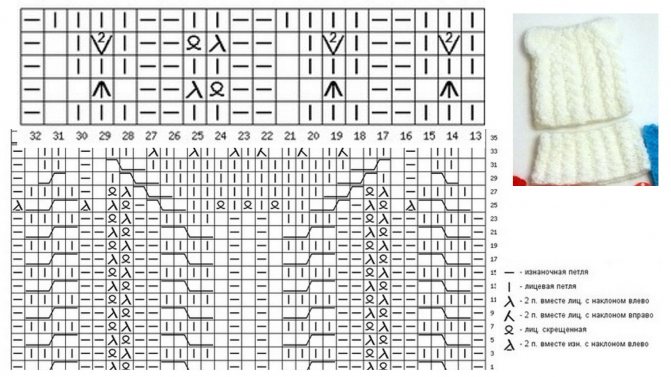 - Для изготовления резинки шапки нужно использовать первую схему. Это ¼ часть всего изделия (рапорт). Остальные 4 части вяжутся таким же образом, повторяя заданный узор.