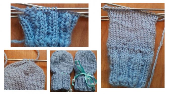 - Когда останется 4 петли закончить работу, провязав их 1 лицевой петлей. Сформировать узел и протянуть его вовнутрь уже полученной варежки.