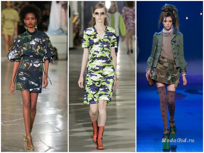 Несмотря на то, что камуфляжные принты встречались в весенне-летних коллекциях 2020 в меньшей степени, чем остальные вышеперечисленные, обойти их вниманием никак нельзя. Во-первых, потому что по модным прогнозам в ближайшее время снова в тренде будет милитари. Во-вторых, камуфляжный принт в одежде наделяет женщину определённой силой и мощью, стирая границы гендерной принадлежности.
