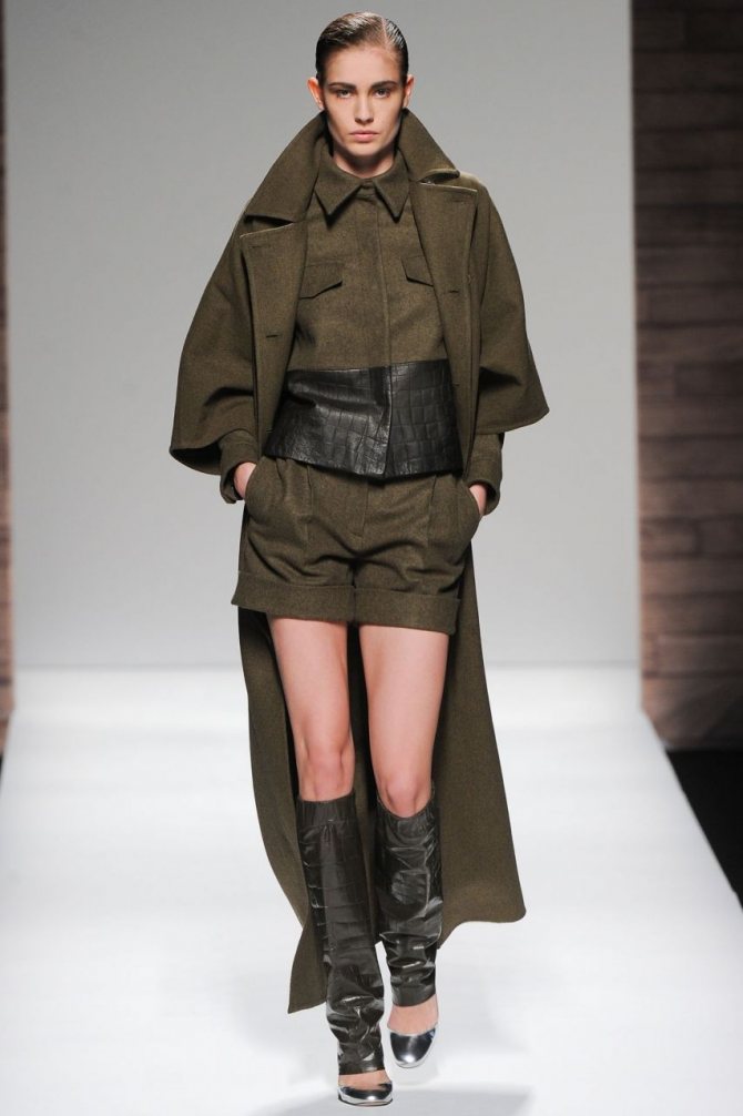 На базе этого пальто в стиле милитари можно построить актуальный лук