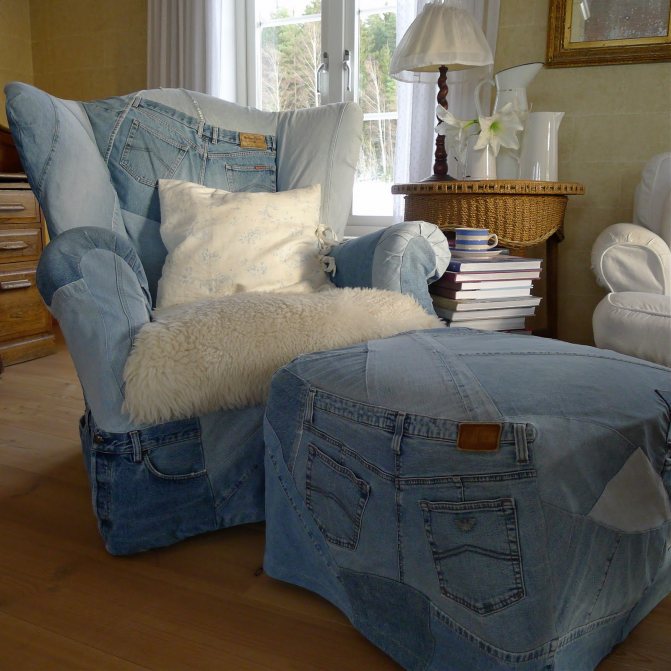 Освежить интерьер и привнести в него новые интересные нотки позволит все тот же старый деним. Сегодня в магазинах можно купить интересные дизайнерские вещицы, оформленные в джинсовом стиле. Но зачем переплачивать, когда есть старые джинсы, и не одни?
