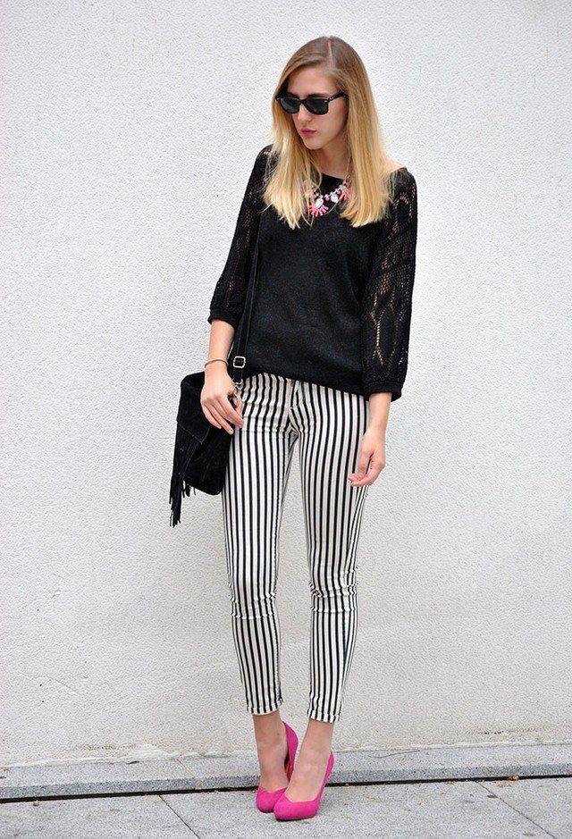 Комбинируйте полосатые брюки и с белым верхом. В таком верхе допускает неброский принт.