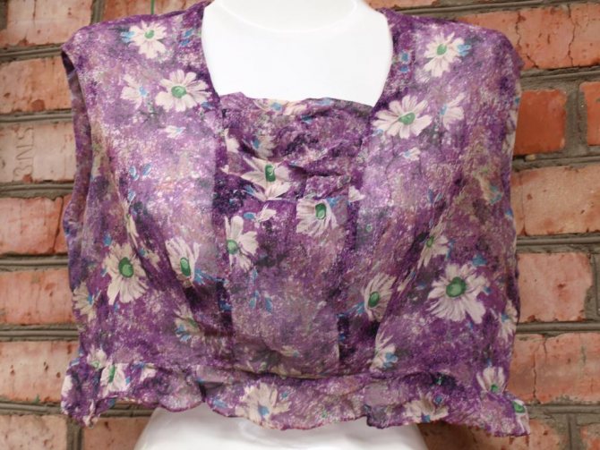 Изделия из креп жорж выглядят достаточно винтажно. Поверхность слегка шероховатая. Но на ощупь она очень приятная. Присутствует бархатный блеск. Одежда получается достаточно плотная и упругая.