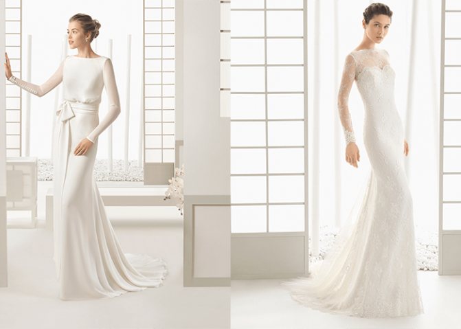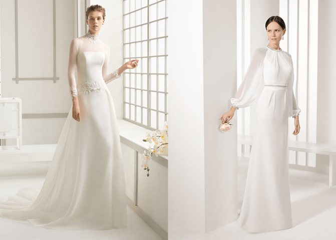 Это самый скромный вариант для венчания. В наряде полностью закрыты руки, плечи, грудь и спина. В нем нет декольте или выреза. Вместо них – воротничок-стойка, который прикрывает шею. Кстати, в таком одеянии прекрасно будет смотреться невеста с пышными формами. Кроме того, он подойдет и для зимней церемонии. В платье будет тепло и комфортно.